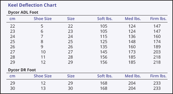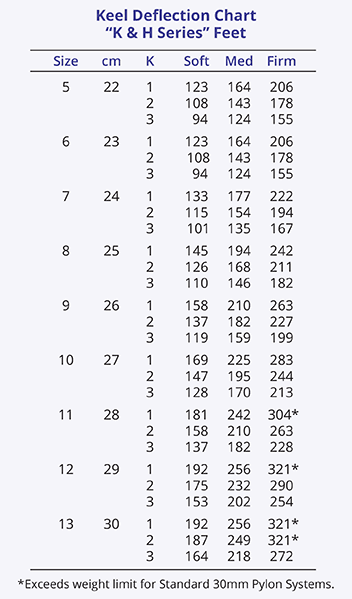 Weight shown for each K Level is the maximum for the Soft, Medium and Firm Category by foot size. K1 is for K1A K Series feet only. K2 is for K2A, K2U, H2A and H2U Series feet. The K3 is for K3U and H3U. Larger keels can be substituted in smaller foot shells to accommodate the client’s weight up to two sizes (non-returnable).